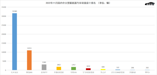 2022年11月国内中大型新能源汽车销量前十排名,数据来源于乘联会,连线出行制图