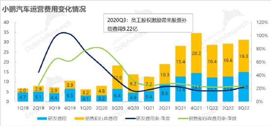 另一边,汽车产品力弱于同行,小鹏不得不维持较高的营销费用。为了快速向全国市场渗透,2021年小鹏开放了加盟模式(蔚来和理想全部直营),整体门店数呈现快速扩张的局面。但销量在2022年呈现萎缩的态势,使得运营成本无法分摊,2022年Q3显示运营亏损率已经达到32%,亏了22个亿。