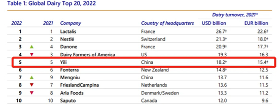 根据荷兰合作银行所发布的“全球乳业20强”排行榜,2021年,伊利以182亿美元的营业额在全球乳业中排名第五,法国兰特黎斯Lactalis、瑞士雀巢、法国达能集团分别以267亿美元、213亿美元及209亿美元的销售额排名前三位。