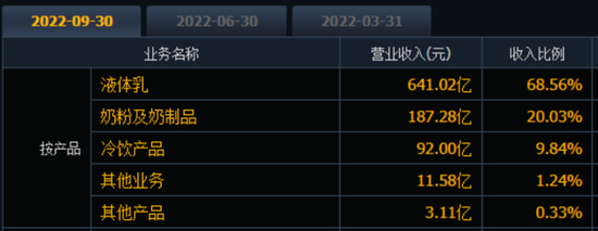 分产品来看,前三季度伊利液体奶、奶粉、冷饮、其他产品(健康饮品)实现营业收入分别为641.02亿元、187.28亿元、92.00亿元和3.11亿元,同比增幅分别为-0.95%、60.50%、32.43%和109.32%。