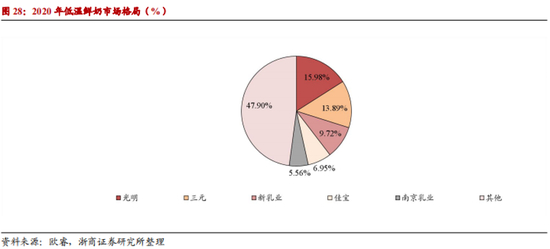 不过,面对着低温奶市场这一“最后一场牛奶战争”,伊利股份并不擅长。根据浙商证券数据,2020年低温鲜奶领域国内三强依次为光明乳业、三元股份以及新乳业,三者市占率分别为15.98%、13.89%和9.72%,伊利股份未进入到行业前五。