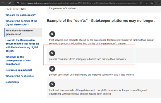 欧盟委员会对该法律提供了官方解读,明确规定了数字市场平台“不得阻止消费者发布外链”: