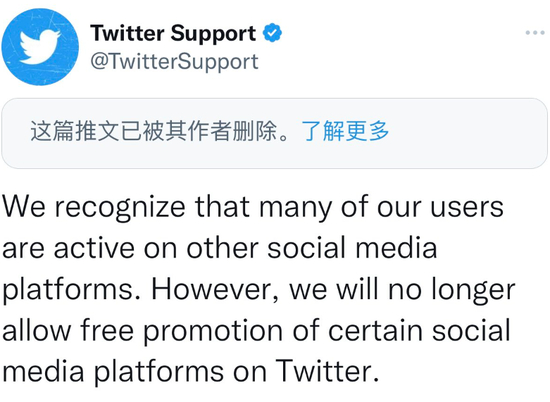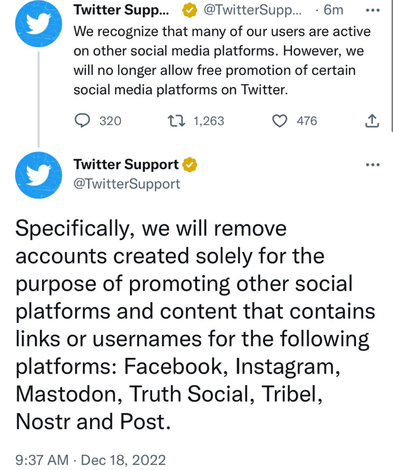 “我们明白很多 Twitter 用户也活跃在其他社交网络平台上,但是从今天起,我们将不再允许在 Twitter 上对特定其他社交网络平台进行免费推广的行为。”