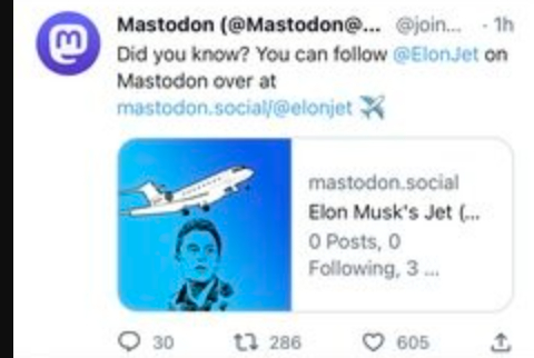 次日,也就是上周四12月15日,去中心化社交媒体平台长毛象 Mastodon 在自己的 Twitter 账号上发布了 @ElonJet 的信息,欢迎网友到长毛象上继续关注这个账号。(补充阅读:Twitter难民涌入“长毛象”,这个小众社交平台缘何一夜爆红)