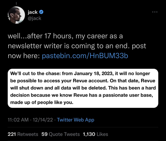 马斯克转身就把 Revue 关闭了。Dorsey 的原版文章,目前已经无法访问。他苦笑地表示,自己作为新闻信作者的职业生涯,还没开始就已经结束了……