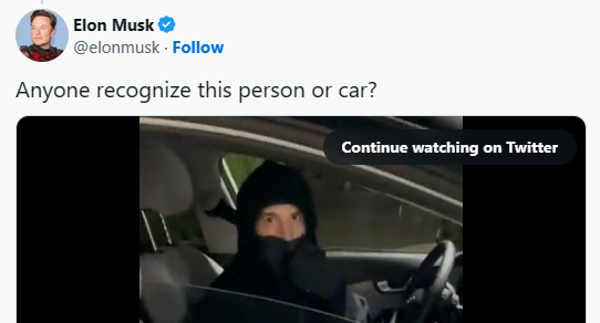 马斯克宣称该账号进行了“人肉”的行为,对自己和家人的安全造成了严重侵害:在12月13日周二晚间,自己的小儿子 X 在洛杉矶坐在一辆车上,遭到了“疯子跟踪狂”的追踪,并且对方以为车上的人是自己。“对方挡住了我们的车的前进,甚至爬到了车盖上。”马斯克声称。