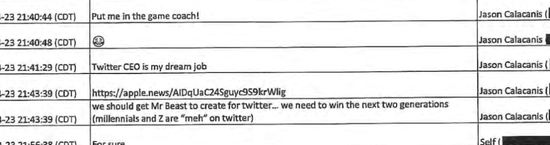 早先收购交易陷入僵局,马斯克遭到 Twitter 起诉的时候,有一条短信因成为呈堂证供而被曝光:Jason Calacanis,也就是刚才提到的马斯克小弟之一,在马斯克收购 Twitter 的计划曝光之后,给大哥发了这样一条信息: