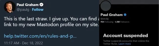在宣布自己将要放弃 Twitter 平台,并且要求粉丝关注他的长毛象账号之后,他的 Twitter 账户也被封禁了(他并没有在推文中贴出长毛象链接,只是提了一句“粉丝可以在他的个人网站上找到相关信息”,也还是被封了)