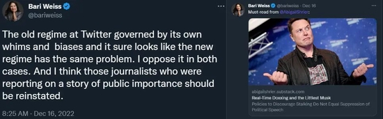 比如过去几周里跟马斯克打得火热的独立撰稿人 Bari Weiss:她是前《纽约时报》评论部编辑,因政治光谱不匹配等问题从时报辞职并撰文批评了前东家。在 Twitter Files 事件中,她也是参与调查和爆料的操作者之一。