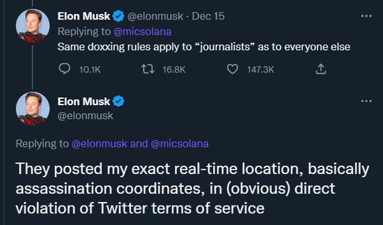 马斯克的“官方”解释是:这些记者对“@ElonJet 被封事件”的报道,实际上构成了对自己的“人肉”,“基本上就是发布暗杀我的坐标。”