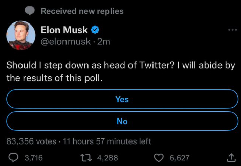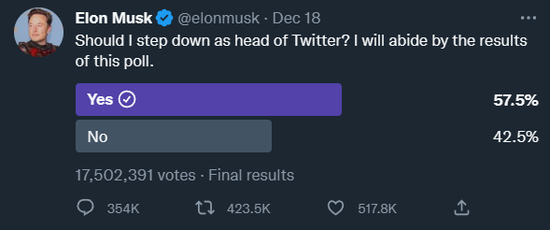 至于投票的结果,也没有任何悬念:支持马斯克辞职的投票者占比超过57%。