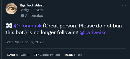 一个跟踪科技类账号的机器人显示,马斯克在当天就对 Weiss “取关”了: