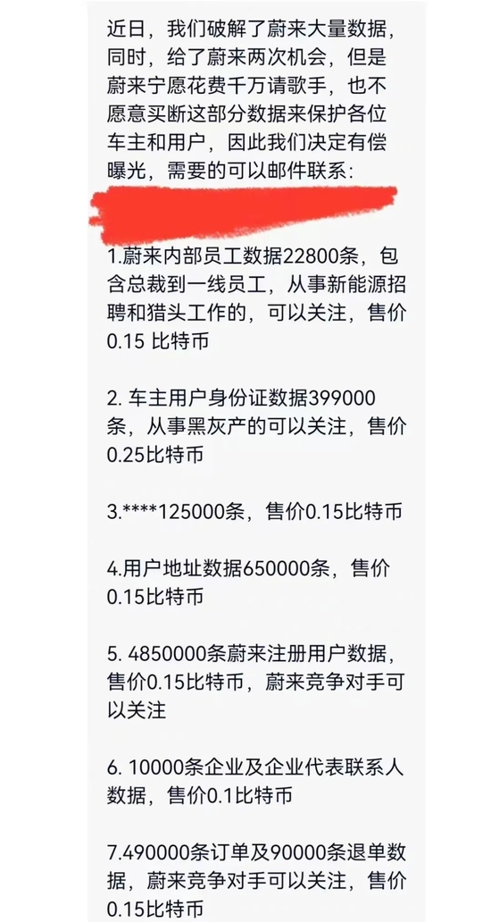 勒索者在对外公布的勒索信中写道:近日来我们破解了蔚来汽车大量数据,同时给了蔚来两次机会,但是蔚来宁愿花费千万请歌手,也不愿意买断这部分数据来保护各位车主和用户,因此我们决定有偿曝光。
