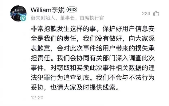 蔚来汽车创始人李斌也道歉称:保护好用户信息是我们的责任,我们没有做好,深表歉意,会对此承担责任。同时,会追查到底,不会与不法行为妥协,也请大家及时提供线索。