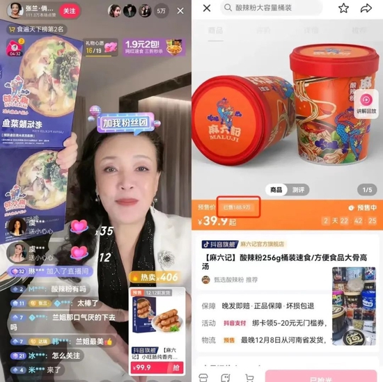 11月23日至12月8日,“张兰·俏生活”共开播58次,直播间热度一度超过东方甄选成为带货榜榜首,直播销售额近2.5亿元,张兰个人粉丝量也从267.42万上涨至751.81万。与向太不同,张兰直播带货的选品大多是自家的麻六记品牌,凭借着与网友的积极互动和大气的谈吐风格收获了网友们的喜爱。