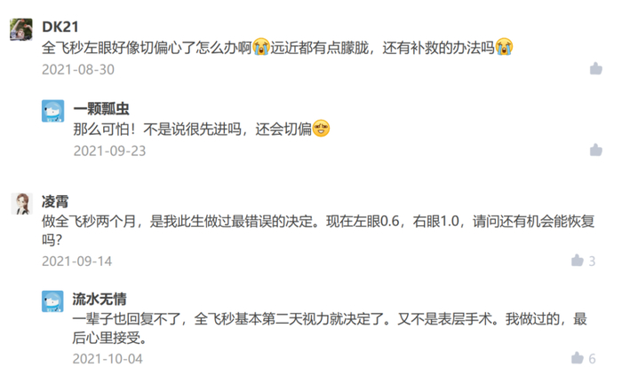 全飞秒手术也并不如宣传的那么完美,有众多网友在社交媒体上发文吐槽,引得诸多境遇相似的患者共鸣,纷纷表示后悔做全飞秒手术。