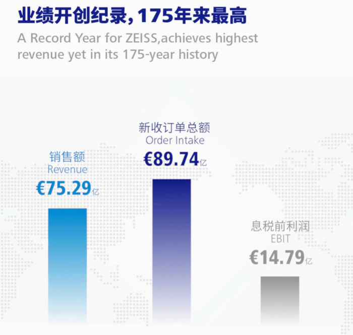在2021年,蔡司在全球经济整体下行的情况下还取得了175年以来的最好成绩,全年实现营收75.29亿欧元,新收订单总额更是高达89.74亿欧元,息税前利润为14.79亿欧元,约合人民币110亿元。其中医疗技术业务营收为19.51亿欧元,同比增加18%。其中大中华区的表现亮眼,同比增幅超过15%。