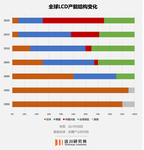 90年代初,日本面板产能占全球94%,在全行业一手遮天。但由于经济不景气,日本企业投资意愿下滑,韩国趁势在亚洲金融危机期间狠砸面板产业,越亏越投。三星和LG的市场份额接近50%,成为面板新霸主,打得日本公司无力招架。