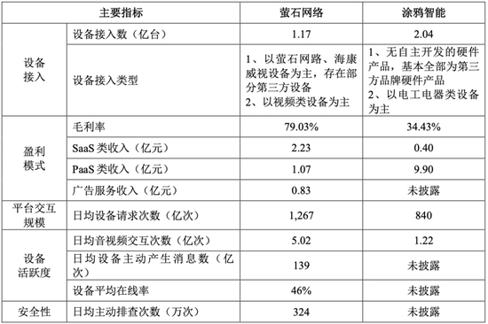 这方面可比的平台,有华为的好望云平台、小米的IoT平台、阿里的飞燕平台、涂鸦智能等,前三者属于大型科技集团的下属平台,公开信息较少。因此萤石网络在其招股书中主要与涂鸦智能进行了比较。
