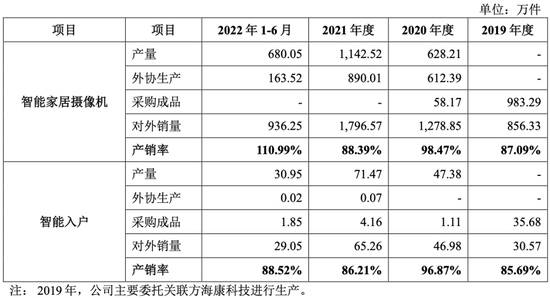 其智能家居产品产销情况如下所示,2021年因采取了积极的生产及备货策略,产销率略有下降,今年上半年销售了较多库存智能摄像机,故产销率较高,智能入户产品产销率则维持相对稳定。