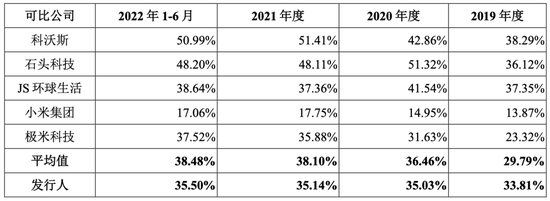 2019年至2022年上半年,萤石网络主营业务毛利率分别为33.81%、35.03%、35.14%和35.50%,总体水平接近于同行业可比公司平均水平。
