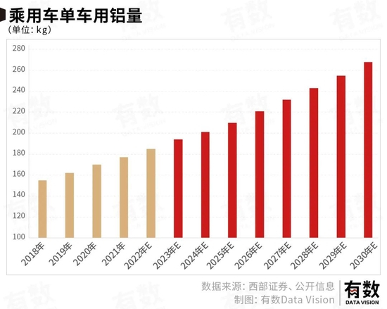 根据国际铝业协会测算,2019年纯电动车的单车用铝量143kg,预计2025年新能源单车用铝量将达227kg,增长超55%。
