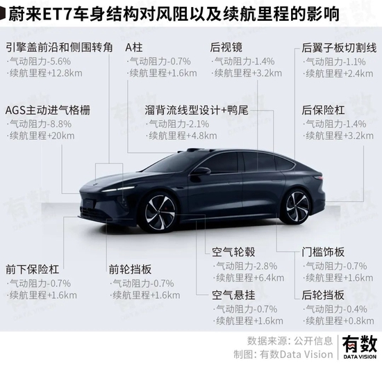 除隐藏式门把手之外,汽车的其他外观对续航影响也不小。例如,极氪001,通过11项技术优化,提升续航55.8公里,蔚来ET7,通过13项技术优化,提升续航61.8km。