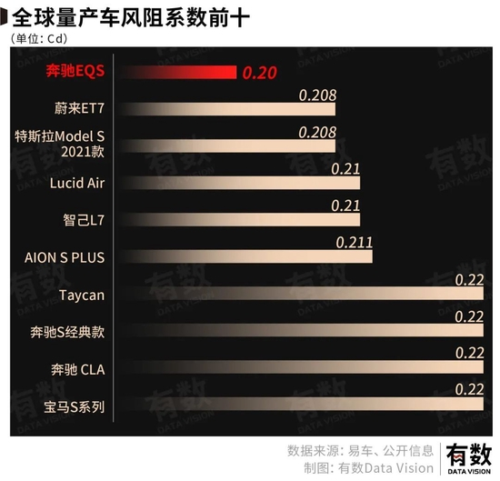 目前,全球风阻系数最低的是奔驰的EQS,风阻系数仅为0.20Cd。