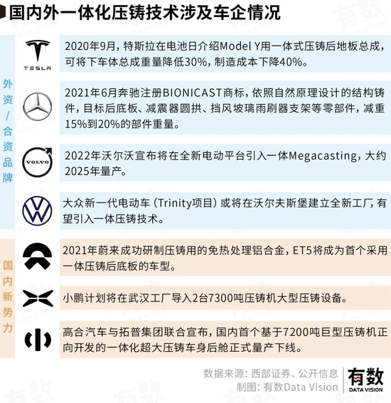 有了特斯拉这个引路人,海内外车企也都开始加入到一体化压铸的行列中。