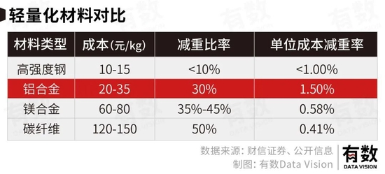 材料端,当前的探索方向主要包括先进的高强度钢、铝合金、碳纤维复合材料,替代主流低碳钢,可以分别减重25%/40%/60%。