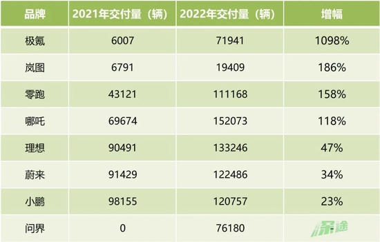 跟2021年相比的话,新势力们在2022年都是增长的。其中增速最快的是极氪、岚图、零跑、哪吒,不过一个原因是它们之前的基数小。蔚小理中,理想的增速不错,蔚来、小鹏一般。