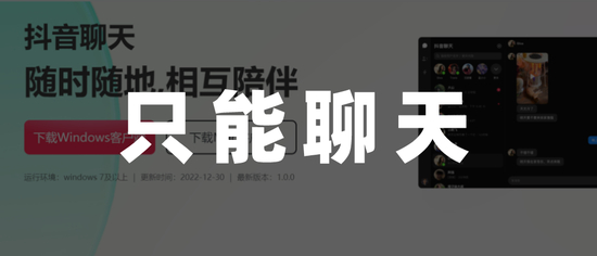 12月30日,抖音官方网站上线了名为“抖音聊天”的即时通讯软件,提供Windows和Mac桌面客户端,最新版本显示为1.0.0。
