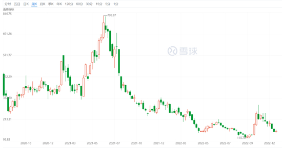 不过,“第四针”正式开打的消息并没有继续提振康希诺的股价。相反,自2022年11月14日之后,康希诺股价重新掉头向下。截至2022年12月30日,康希诺股价重新跌至146.02元,总市值约为361亿元,2022年全年跌幅达到51%。如果从2021年6月的高点算起,康希诺股价跌幅已经超过80%。