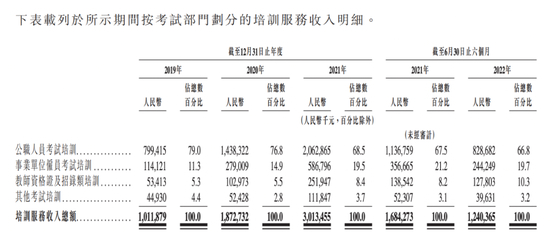 从粉笔的业务上来看,公考培训是近几年粉笔职业培训业务营收的“顶梁柱”。据招股书显示,2020年公考收入超过事业单位、教资、财会考试等收入的总和,占到培训服务类收入的76.8%。