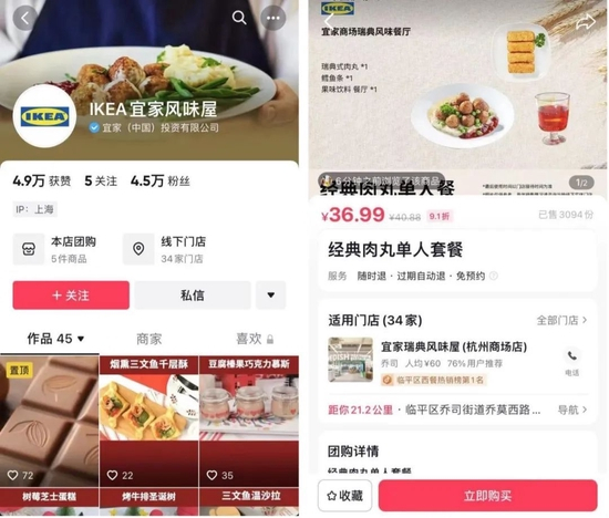 今年7月,“IKEA宜家风味屋”的抖音账号正式上线,该账号的认证主体为(宜家)中国投资有限公司,发布的视频以肉丸、牛排、松饼、各类蛋糕美食为主。IKEA宜家风味屋后续还尝试了直播带货,销量最高的是宜家瑞典风味餐厅的经典肉丸单人套餐,售价36.99元,目前已经迈出了3094份。