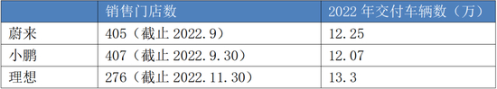 蔚小理三家车企门店数和2022年销售量