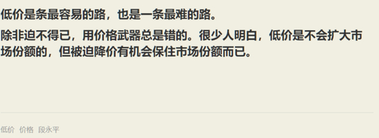 十几年前,段永平在评价苹果和茅台的时候,这么说:“除非迫不得已,用价格武器总是错的。低价是不会扩大市场份额,只是保住原本的而已。“