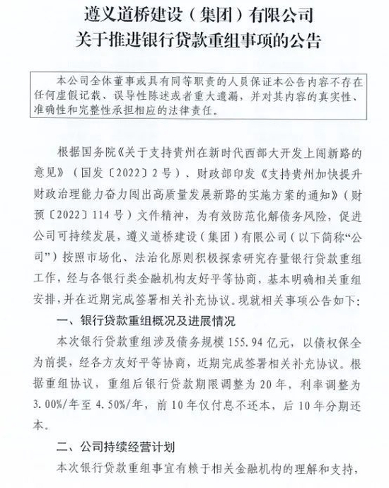 因为遵义道桥的背景,借款银行最终将其贷款延期20年,并把贷款利息减半。20年还款期间还被分为两部分,第一部分是前十年,只支付利息,后十年才逐年偿还本金。