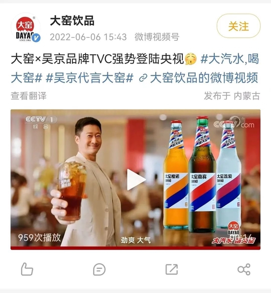 今年春节,大窑汽水延续了与吴京的合作。1月19日,大窑汽水官方公众号宣布,2023年将继续签约吴京为代言人,还发布了吴京手持大窑汽水拜年的视频。