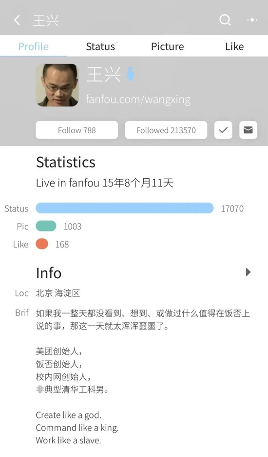 “如果我一整天都没看到、想到、或做过什么值得在饭否上说的事,那这一天就太浑浑噩噩了。”众所周知,这是写在王兴最后的“精神家园”——饭否简介里的内容。
