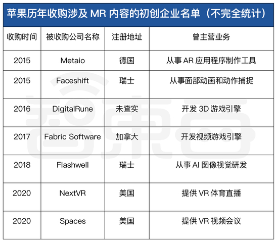 ▲苹果历年收购涉及MR内容的初创企业名单(不完全统计)