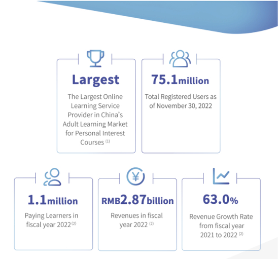 弗若斯特沙利文报告显示,如果按 2021 年收入计算,量子之歌已是当下我国成人个人兴趣在线学习市场前五大服务提供商之一,截至去年 11 月,已累计为超过 7510 万名学员提供知识学习分享服务,范围触达全国 34 个省级行政区。尤其在学员规模上,公司去年迎来井喷式增长,学员数量是 2021 财年 1700 万的近 4.5 倍,涨幅超过 340%。而在用户付费意愿上,量子之歌同样取得重要突破,截至去年 6 月,共有 110 万人次的付费用户,相较 2021 财年的 80 万人次上涨了 37.5%。
