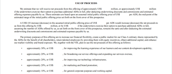 招股书内容也印证了李鹏的言论,根据计划,量子之歌此次 IPO 所得的资金约 30% 将用于提高用户学习体验和内容开发能力;约 20% 用于扩大服务范围和拓展海外业务;约 20% 用于品牌营销推广;约 20% 用于技术提升;约 10% 用于营运资金和一般公司用途。可以看到,在资金运用上,内容开发以及业务拓展这两大块的占比已达到 50%,可见其在发力终身教育方面的决心。