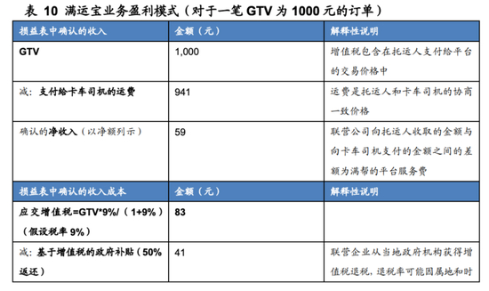 从无车承运业务的具体盈利模式来看,以GTV口径1000元的订单为例。满帮收取5.91%的服务费(2021年服务费率)确认为净收入,若不考虑其他税项,仅考虑最主要的增值税,平台需要负担销项增值税83元(增值税率9%),政府通过税收返还的形式补贴41元,平台成本确认增值税42元,则该项业务最终产生利润17元,毛利率为28.8%。