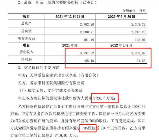 1月3日,爱尔眼科发布公告,将收购绍兴爱尔、舟山爱尔等14家医院部分股权,其中绍兴爱尔2022年前9个月就只赚了31.53万元,甚至2021年还亏了88.1万元。如果以148万元的净资产衡量,那么爱尔眼科这笔收购的溢价高达净资产的55倍。