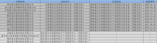 除绍兴爱尔外,本次收购的其他13家公司也均出现高低不同的溢价情况。尤其值得注意的是,爱尔眼科这次收购的14家公司中,大部分公司都是从天津爱信企业管理合伙企业(简称天津爱信)手中接来的,显而易见这家公司与爱尔眼科之间有着千丝万缕的联系。