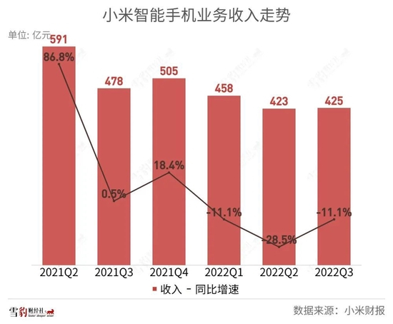 从财务数据看,性价比路线越来越难走,小米亟需高端产品拯救。据财报数据,2022年Q3,小米智能手机业务实现营收425亿元,同比下降11.1%,在总收入中的占比由61.3%下降至60.3%,连续3个季度同比下滑。