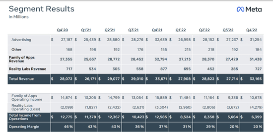 一是关键财务指标超出市场预期。Meta财报显示,四季度收入为 321.7 亿美元,虽然同比降低了4%,但超出了市场预期的 315.3 亿美元和7%的增速下降,代表着Meta一定程度上止住了业务恶化的趋势。每股收益为1.76美元,同比下降52%,虽然低于分析师预期的2.22美元,但由于其对应用程序系列部门和 Reality Labs 部门的进行了重组花费了近40亿美元,所以并不是业绩造成的。