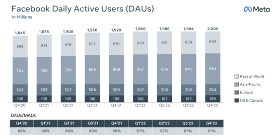 第二个原因是Facebook仍在增长,社交家族用户数量没有继续下滑。去年一季度Facebook用户数量的首次下降曾让Meta遭受重挫,导致市值瞬间蒸发千亿。但目前看来这样的下降趋势并没有继续,四季度Facebook日活用户首次突破了20 亿大关,比一年前增加了超过约 7000 万人次。整个社交家族App的日活用户达到29.6亿,继续保持同比和环比增长。