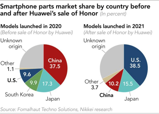 此时,荣耀正逐步摆脱华为的阴霾,依靠开放供应链的技术突围。2022年4月,日经亚洲发布消息称,荣耀手机美系芯片成本占比为39%,对比2020年初增长了29%;国产零部件占比仅为10%,下跌27%。